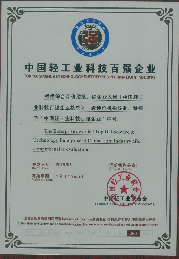 Title of China's Top 100 Light Industry Technology Enterprises